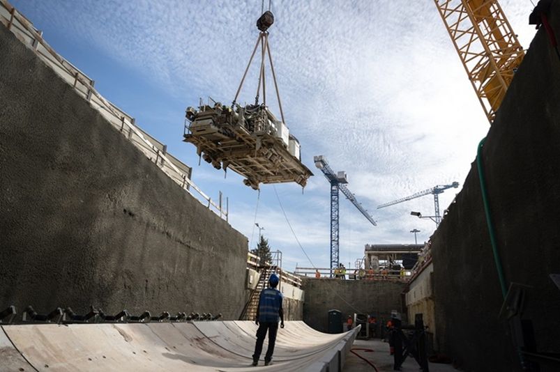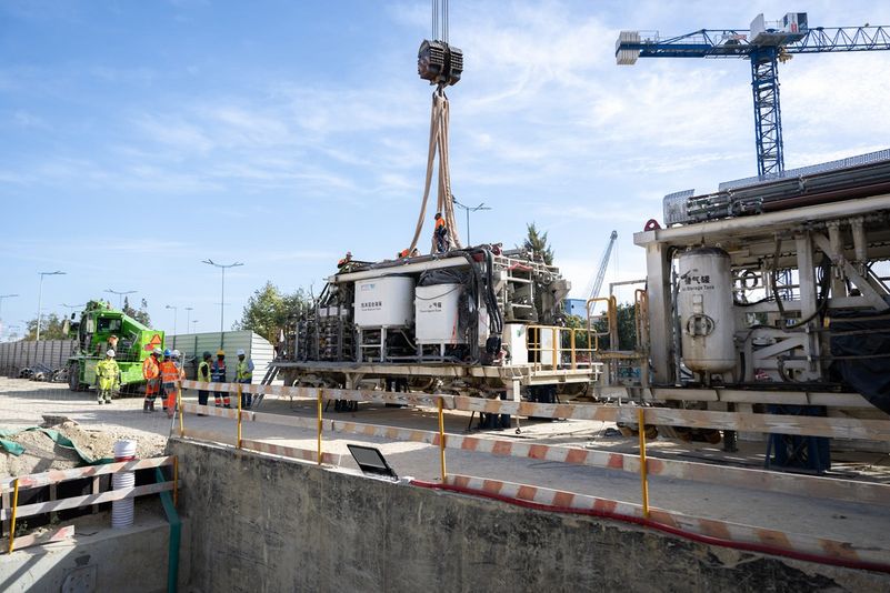 Já está colocado o disco de corte e o escudo que compõem a cabeça da tuneladora. Estão agora a ser adicionados os 11 “gantrys”, carruagens que se ligam a uma locomotiva de comboio.