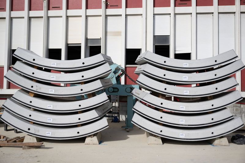 Todas estes elementos da tuneladora são pousados sobre o “berço” que é uma estrutura montada em peças pré fabricadas para a acolher antes de avançar dentro do túnel.